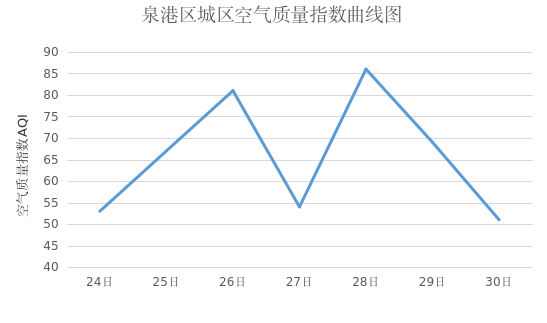 过去一周,泉港区空气质量按照国家《环境空气质量标准》评价,11月24日(周一)至11月30日(周日)为二级(良),首要污染物为PM10。AQI最大的是周五为86,最小的是周日为51。