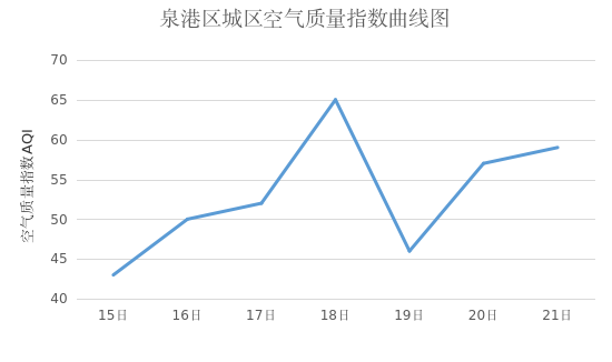 过去一周,泉港区空气质量按照国家《环境空气质量标准》评价,12月15日(周一)至12月16日(周二),12月19日(周五)为一级(优),12月17日(周三)至12月18日(周四),12月20日(周六)至12月21日(周日)为二级(良),首要污染物为O3。AQI最大的是周四为65,最小的是周一为43。