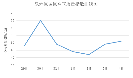 过去一周,泉港区空气质量按照国家《环境空气质量标准》评价,12月29日(周一),12月31日(周三)至1月3日(周六)为一级(优),12月30日(周二)和1月4日(周日)为二级(良),首要污染物为O3。AQI最大的是周二为65,最小的是周五为42。
