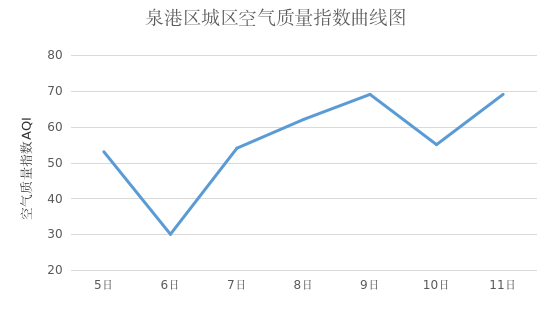 过去一周,泉港区空气质量按照国家《环境空气质量标准》评价,1月6日(周二)为一级(优),1月5日(周一),1月7日(周三)至1月11日(周日)为二级(良),首要污染物为O3。AQI最大的是周五和周日为69,最小的是周二为30。