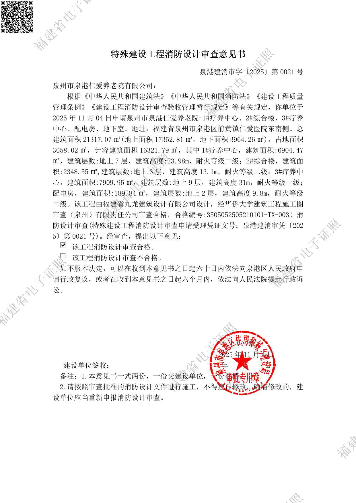 泉州市泉港仁爱养老院-1#疗养中心、2#综合楼、3#疗养中心、配电房、地下室特殊建设工程消防设计审查意见书