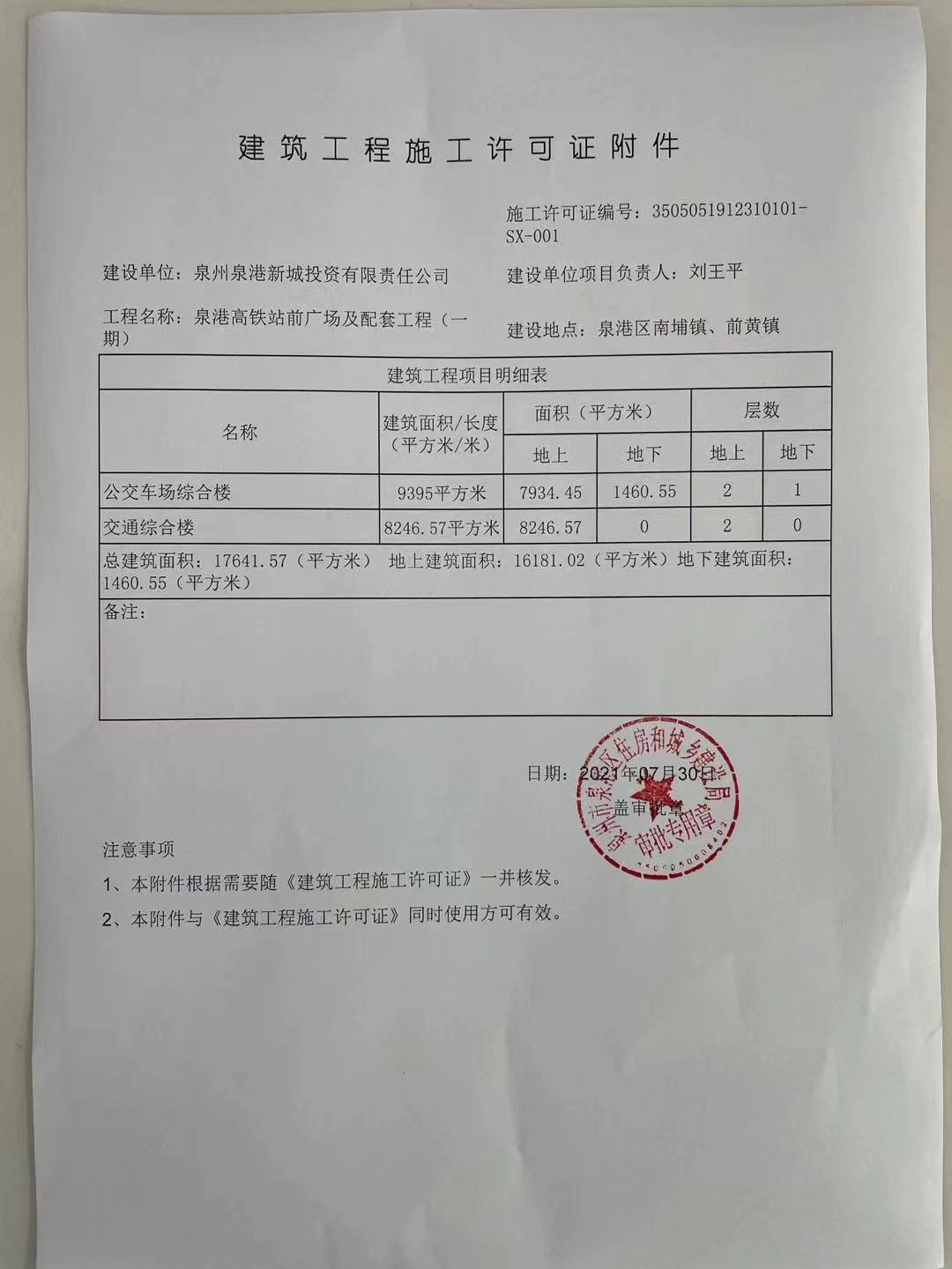 泉州泉港新城投资有限责任公司泉港区高铁站前广场及配套工程(一期)项目建筑工程施工许可证