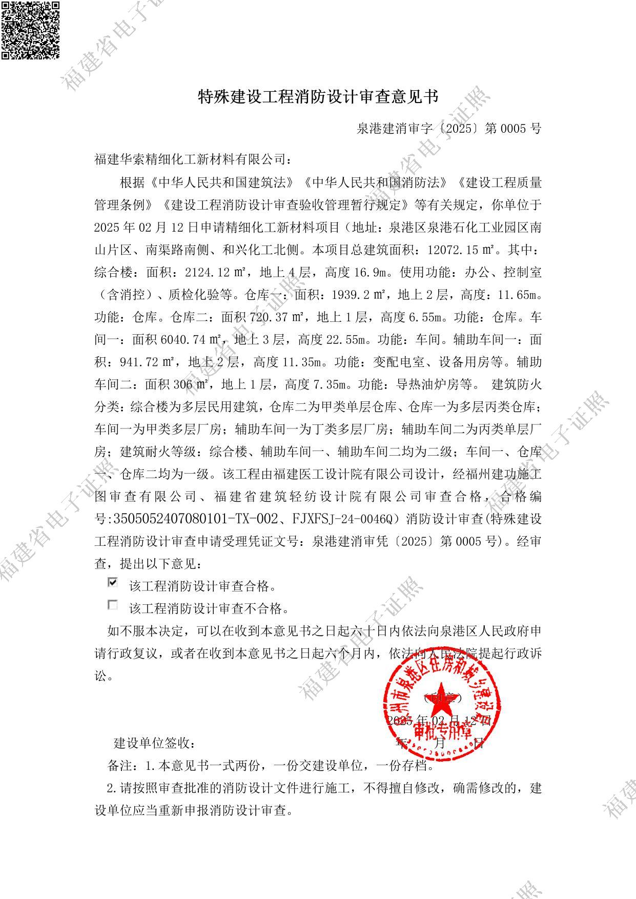 福建华索精细化工新材料有限公司精细化工新材料项目特殊建设工程消防设计审查意见书