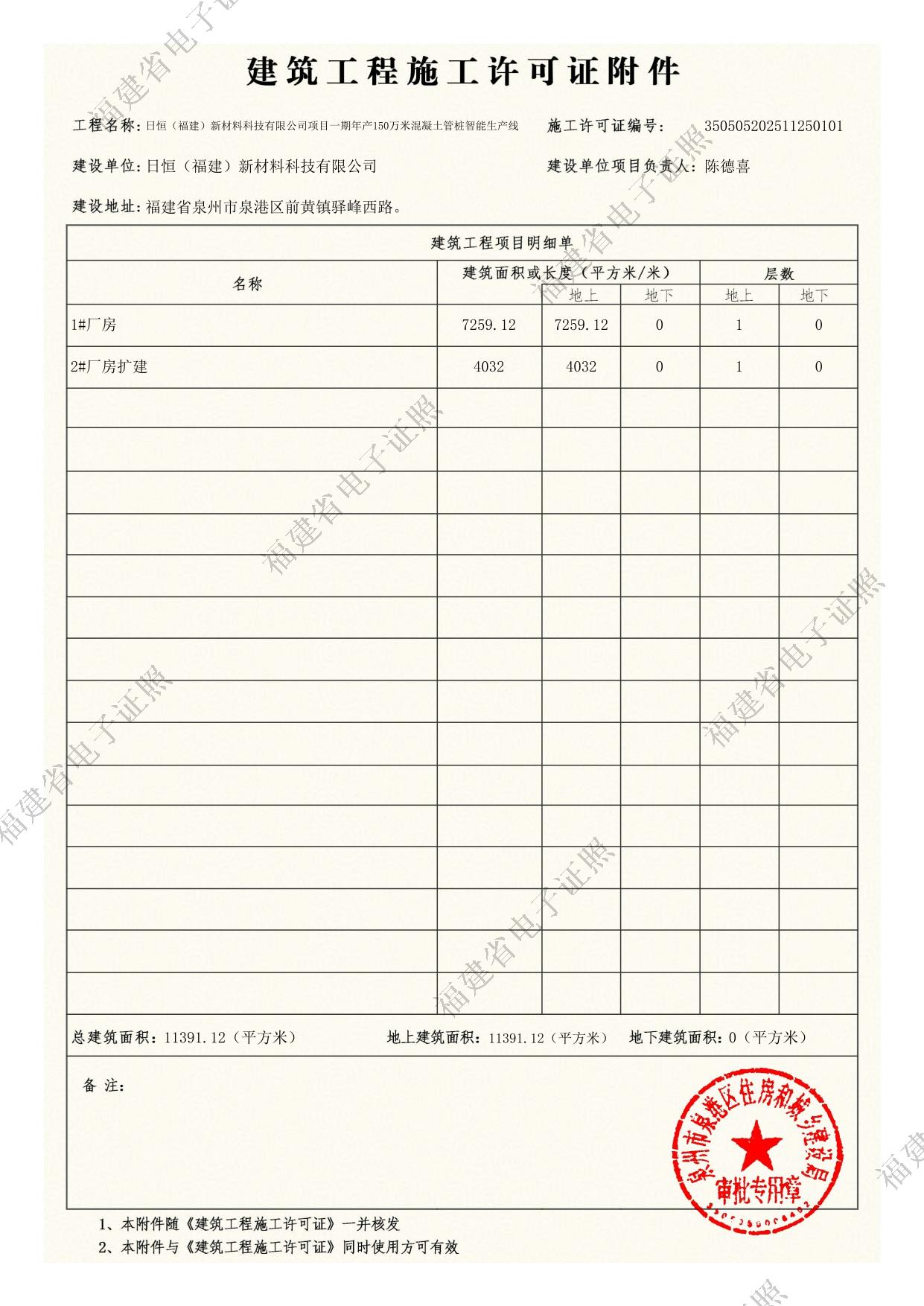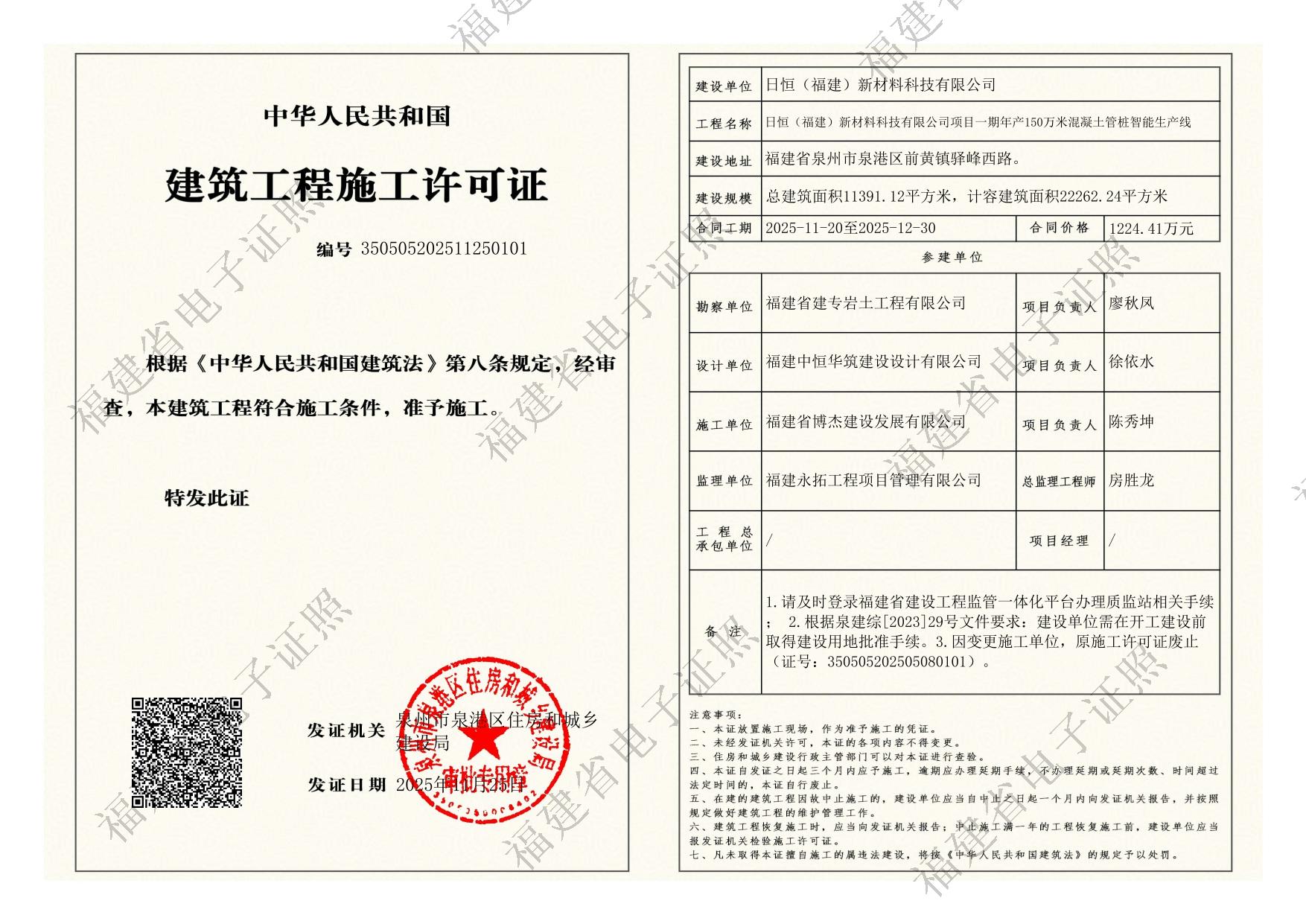 日恒(福建)新材料科技有限公司项目一期年产150万米混凝土管桩智能生产线建筑工程施工许可证