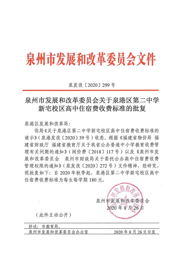 《泉州市发展和改革委员会关于泉港区第二中学新宅校区高中住宿费收费标准的批复》(泉发改〔2020〕299号) |