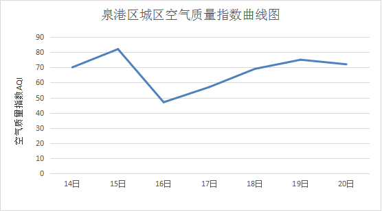 过去一周,泉港区空气质量按照国家《环境空气质量标准》评价,3月16日(周三)为一级(优),无首要污染物。3月14日(周一)至3月15日(周二)和3月18日(周五)至3月20日(周日)为二级(良),首要污染物为O3_8H(臭氧日最大8小时平均);3月17日(周四)为二级(良),首要污染物为PM10(可吸入颗粒物)。空气质量指数(AQI)最小的是周三为36,最大的是周二为82。