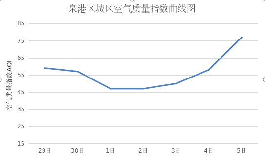 过去一周,泉港区空气质量按照国家《环境空气质量标准》评价,10月1日(周三)至10月3日(周五)为一级(优);9月29日(周一)至9月30日(周二),10月4日(周六)至10月5日(周日)为二级(良),首要污染物为O3。最大的是周日为77,最小的是周三和周四为47。