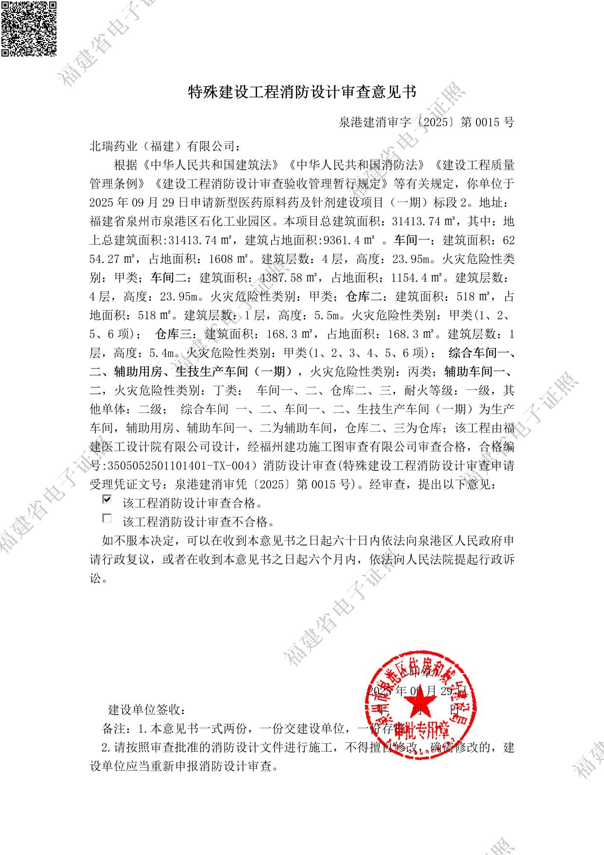 北瑞药业(福建)有限公司新型医药原料药及针剂建设项目(一期)标段2特殊建设工程消防设计审查意见书