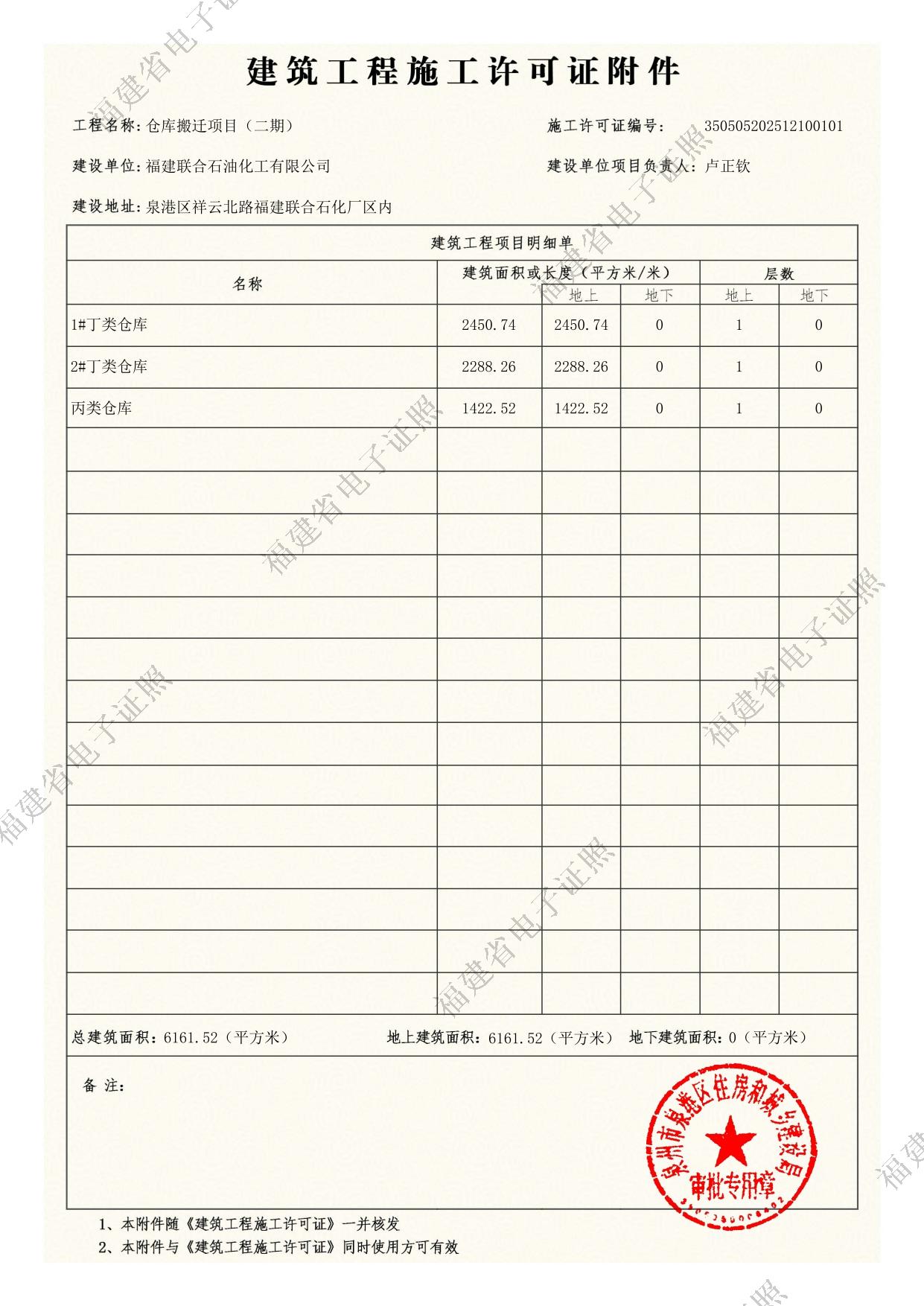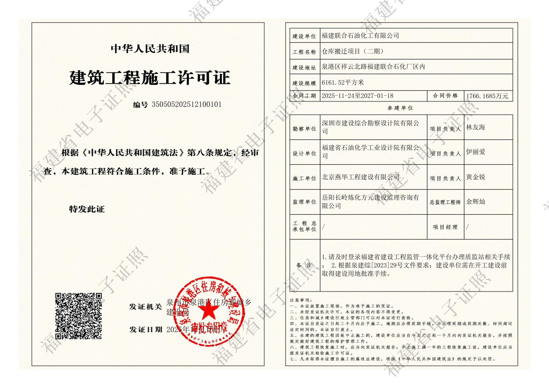 福建联合石油化工有限公司仓库搬迁项目(二期)建筑工程施工许可证